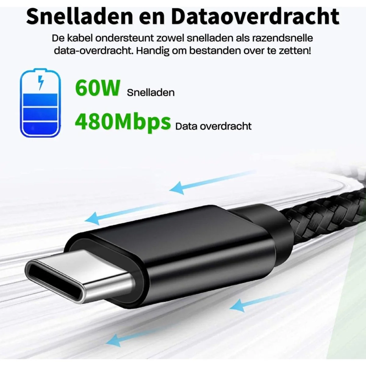 - 2x USB-C naar USB-C kabel: Deze set komt met twee extra robuuste gevlochten USB-C naar USB-C kabels, elk 3 meter lang.