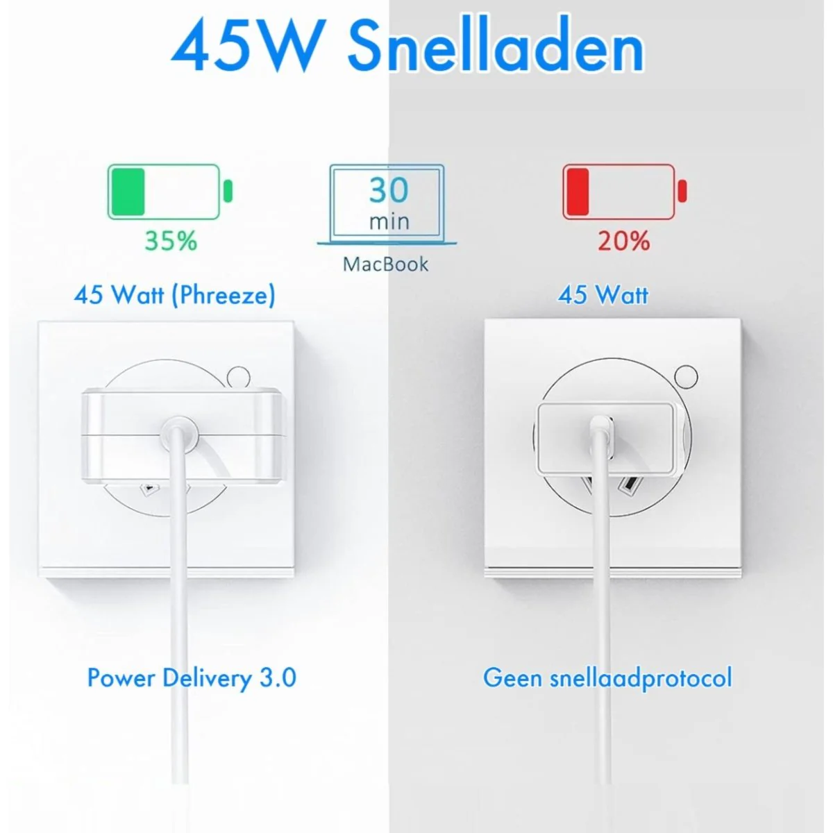 De voedings adapter met usb-c kabel heeft verschillende ingebouwde beveiligingen die beschermen tegen overladen, oververhitting en kortsluiting.