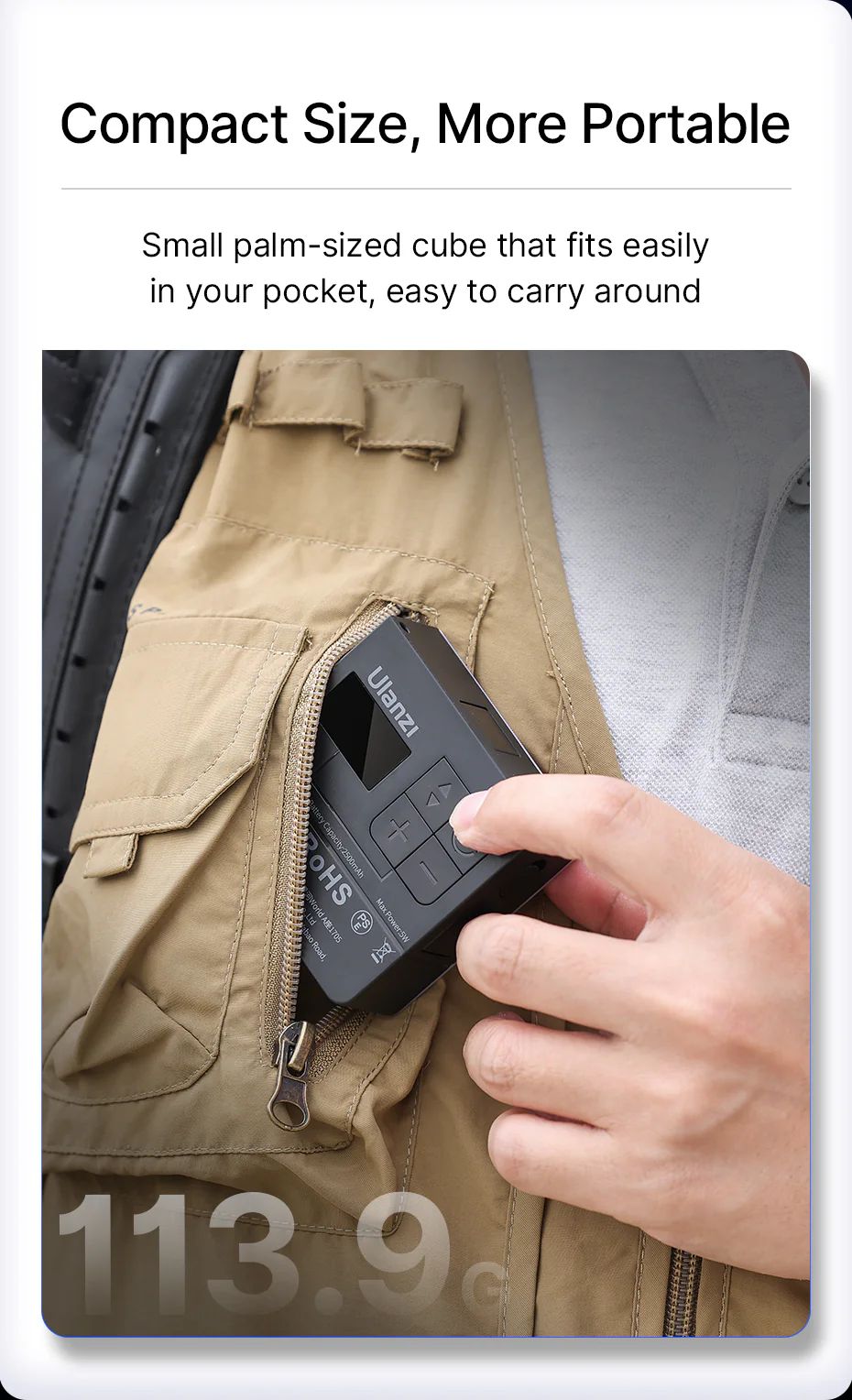 De Ulanzi VL49 RGB Pro heeft een compact en sterk design. Dankzij het stevige kunststof kan je lamp tegen een stootje. Ondanks de ruime batterij en vele functies is de lamp nog steeds compact en met zijn 6.7 bij 6.5 bij 2.7 cm is de lamp mee te nemen in elke broekzak of tas. Opladen doe je gemakkelijk via de USB-C poort aan de zijkant.